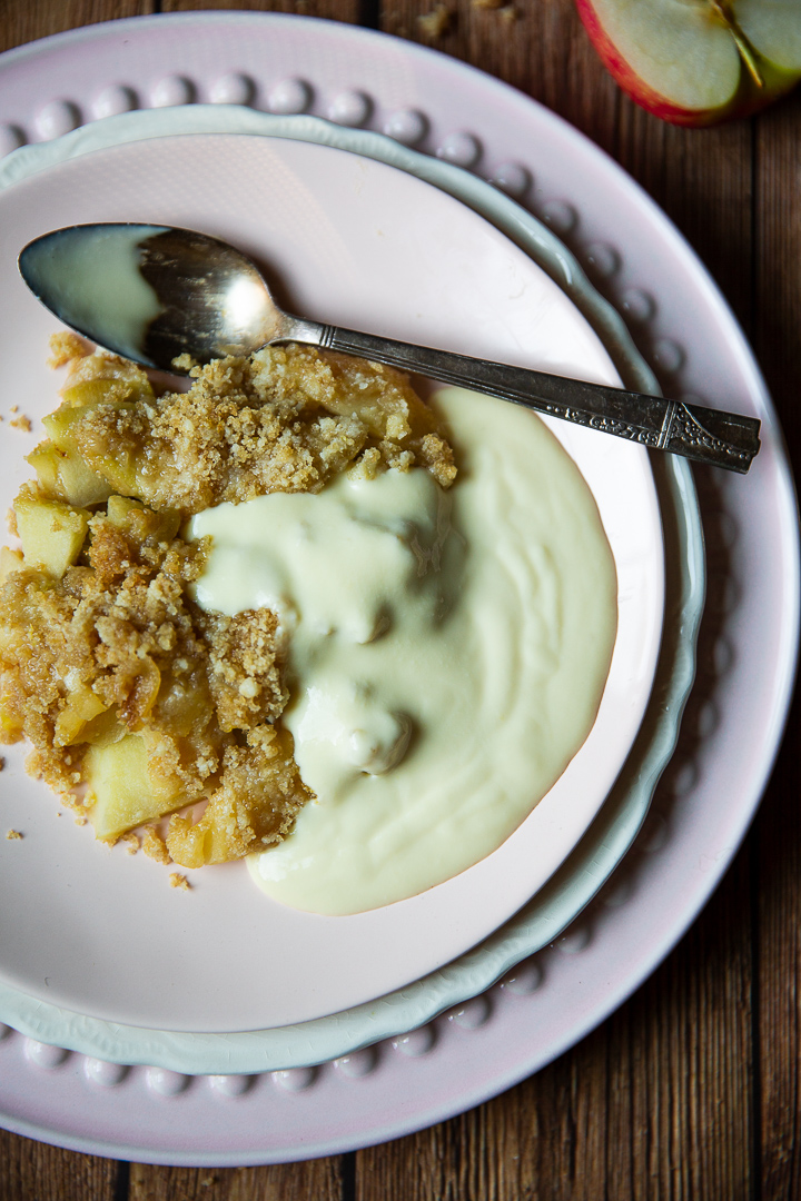 As the cool of autumn collapses into the cold of winter, as the late afternoon sunshine burnishes the remaining stubborn leaves on the tree tops to a gorgeous glowy copper, a world is created where the cosy comfort of an apple crumble is simply divine. While I adore a good crumble with spring and summer fruit, there is nothing quite like the simplicity of the humble apple at this time of year, and apple crumble feels like the crisp white shirt of the crumble world: elementary, yet classic, with hidden depths. You can, of course, use any apple your heart…