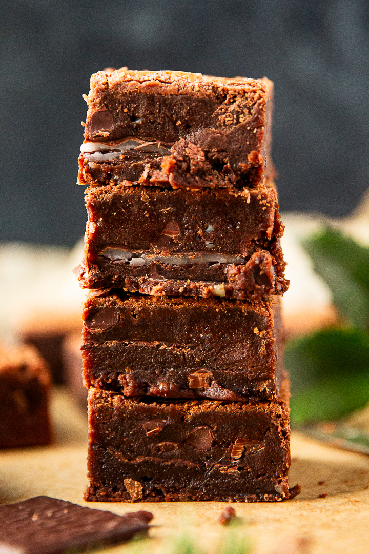 I have been making mint brownies for many, many years. They are my most requested recipe. They have joined in the fun at classroom get togethers, kids parties, picnics and many a holiday gathering. Wrap half a dozen in parchment, tie with ribbon and you’ve got yourself the perfect little gift card holder. Great for teachers or tucked in the mailbox as a nice little holiday surprise for the mailman. They are a doddle to make, a dream to store in the fridge for days and can be frozen and kept on hand for any and all last minute surprises…